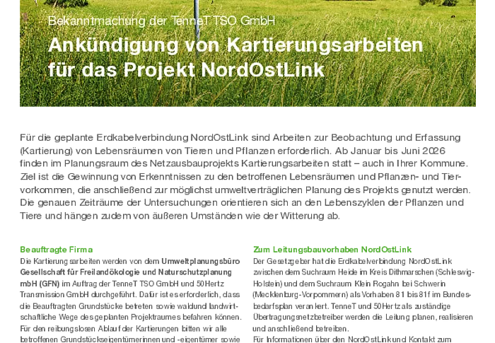 Bekanntmachung der TenneT TSO GmbH - Ankündigung von Kartierungsarbeiten für das Projekt NordOstLink